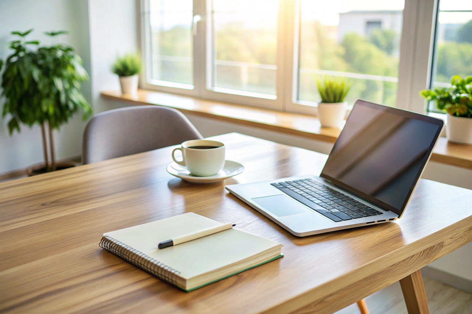 Ein ruhiges, einladendes Büroambiente mit einem leeren Schreibtisch, auf dem ein moderner Laptop und eine Tasse Kaffee stehen, umgeben von Pflanzen und natürlichem Licht, ohne erkennbare Marken oder Text.